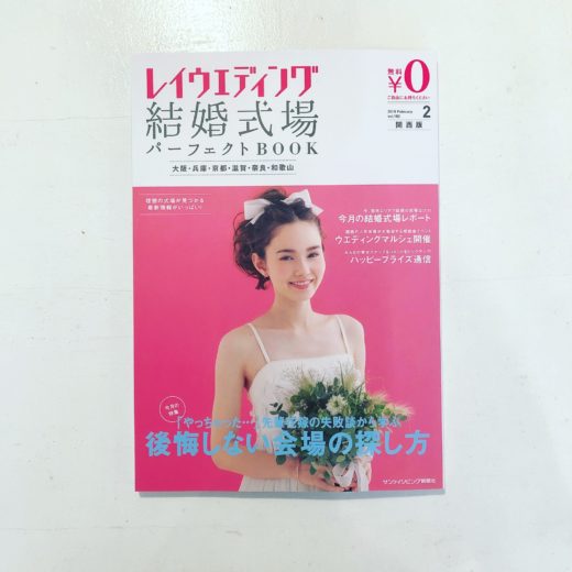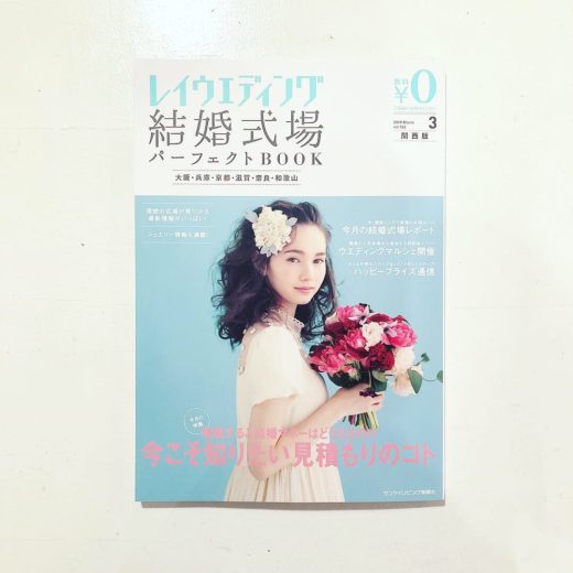 レイウェディング 2月号 関西版 表紙にてHOSHIオーガニックコットンのホワイトドレスを着用頂きました。 NOoRAはビーズと花びらの装飾をしています。